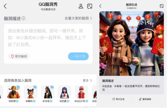 此前,QQ已率先上线“脑洞秀”AI社交功能,其核心特色在于深度融入QQ的好友关系:用户不仅能创建自己的虚拟形象,还可一键@QQ好友,邀请对方以虚拟形象共同参演,实现“隔空同框”。作品可轻松分享至QQ空间或群聊,在QQ社交圈内天然引发互动、评论与二次传播,形成更多人模仿和参与的社交循环。